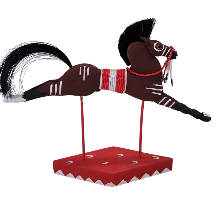 The pieces shown here are examples of previous memorials created by Alvin Ghost Elk Iron Cloud. Each memorial is individually carved for a specific horse. Sizes, details, and pricing vary.